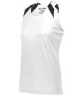 The 4-way stretch properties of the fabric allow for increased mobility, making it ideal for various sports such as field hockey, lacrosse, tennis, track, and training. The tank's moisture-wicking capability keeps you dry and comfortable. It features a ladies' fit, tagless label, racerback styling, and is designed to be NFHS compliant for lacrosse and field hockey (except for the Graphite/White color).