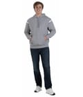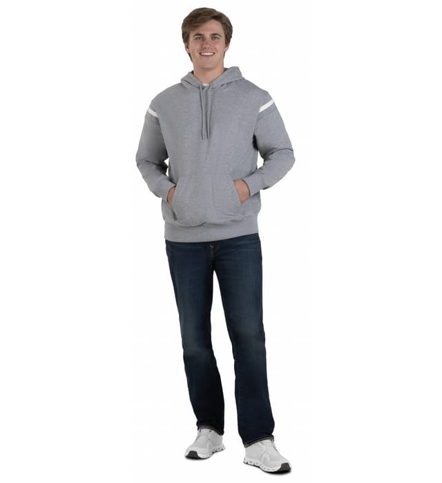 9 oz. 51% polyester / 45% cotton / 4% spandex sport French terry Hanger loop label Self-fabric lined hood with silicone dipped tip drawcord Front kanga pouch pocket Set-in sleeves Spandex blend rib-knit shoulder inserts, cuffs, and bottom band