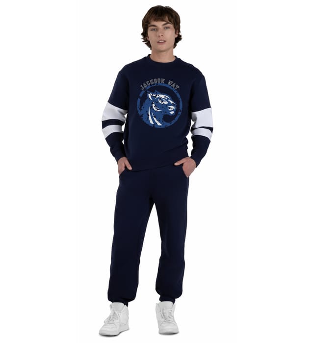 9-ounce, 60% cotton/40% polyester athletic fleece Hanger loop label Crew neck Set-in sleeves Spandex blend rib-knit cuffs and bottom band