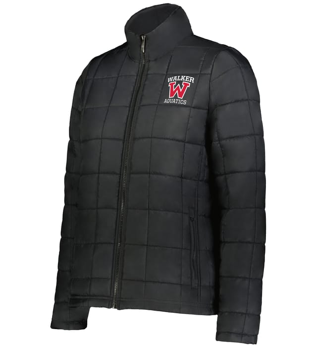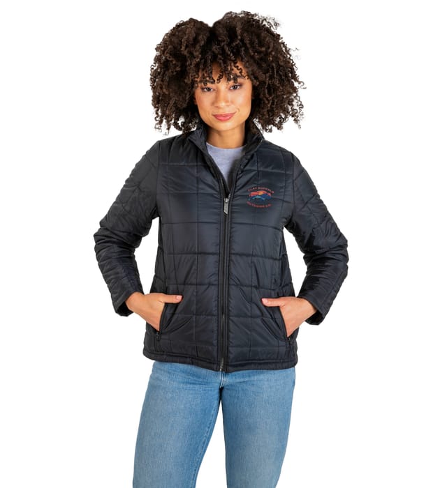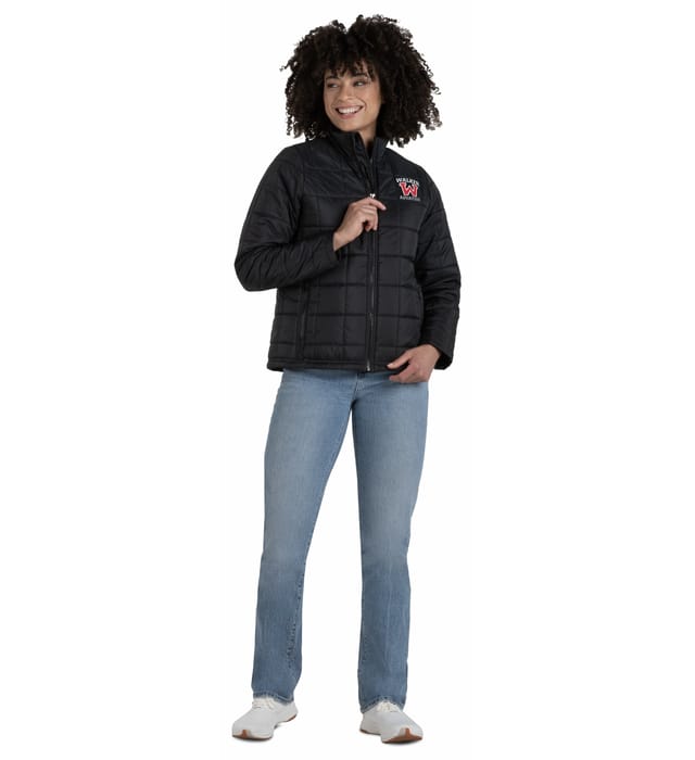 Quilted ladies' puffer jacket with a high collar, durable shell, and water-resistant protection for versatile team wear.