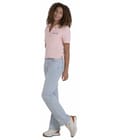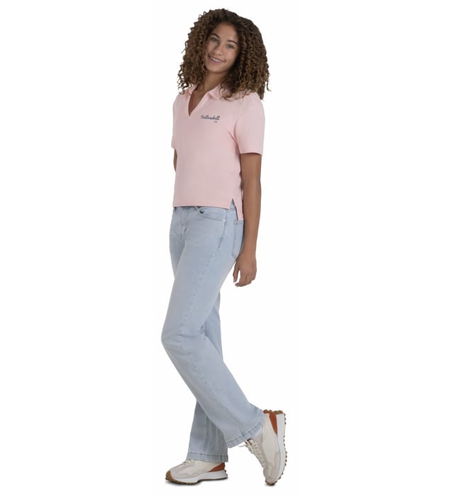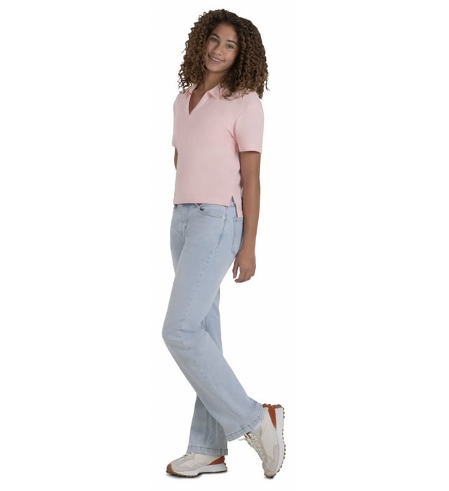 7-ounce, 100% cotton pique Ladies fit Boxy fit Tag-free label Self-fabric Johnny collar Set-in sleeves Side vents Modest cropped length