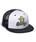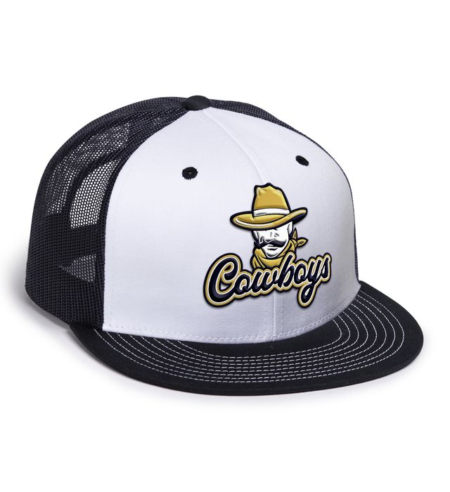 Poly/cotton blend Trucker Mesh Full-profile Flat bill Self-material undervisor Front panel eyelets Pro-stitched finish Contrast stitching Snapback adjustable